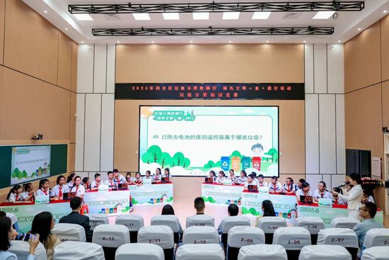 在垃圾分類宣傳講座上,宣講員從垃圾分類的意義、四色垃圾桶的區(qū)別、如何正確投放垃圾等方面,為現(xiàn)場師生講解相關(guān)知識,同時穿插“你問我答”環(huán)節(jié),點(diǎn)燃在場學(xué)生的參與熱情。講座后,來自同安區(qū)第一實(shí)驗(yàn)小學(xué)、第三實(shí)驗(yàn)小學(xué)等6所小學(xué)的學(xué)生們分別組成參賽隊(duì)伍,共同參與垃圾分類知識競賽。