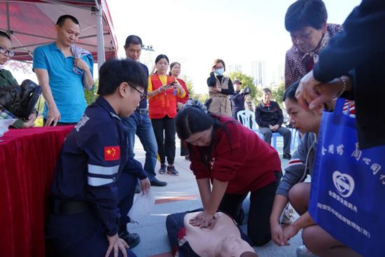 臺上演出精彩,臺下服務不斷。“雙手交叉,十指緊扣,手指翹起,掌根部用力,按壓部位在兩乳頭中線……”在文明集市上,同安區(qū)星暉救援隊的隊員們正為來往的市民介紹CPR心肺復蘇。