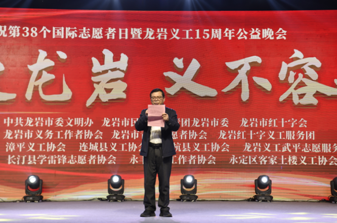 文明風(fēng)12月5日訊 為熱烈慶祝第38個(gè)國(guó)際志愿者日暨龍巖義工成立十五周年,12月2日晚,在中共龍巖市委文明辦、龍巖市民政局、共青團(tuán)龍巖市委、龍巖市紅十字會(huì)共同指導(dǎo)下,由龍巖市義務(wù)工作者協(xié)會(huì)、龍巖市青年志愿者協(xié)會(huì)、龍巖市紅十字義工服務(wù)團(tuán)主辦的“大愛龍巖·義不容辭”大型公益晚會(huì)在龍巖龍津湖百姓大舞臺(tái)廣場(chǎng)舉行。