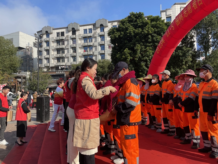 志愿者為環(huán)衛(wèi)工人系上各自手工編織的圍巾