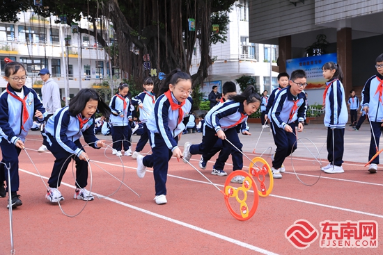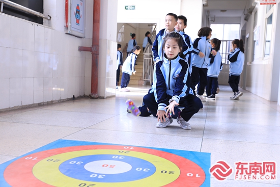 原來,為了豐富學生們的課間生活,該校推出了“你好,10分鐘”?!岸靵砼R,不少‘小懶蟲’們課間都‘窩’在教室里,不愿去操場動一動。于是,我們從學生們的興趣入手,充分利用操場、走廊等空間,并添置一批器材,把閩南童玩引入校園,讓每個學生參與其中,盡情享受課間10分鐘的快樂時光?!睂W校校長曾鳳蓉介紹道。