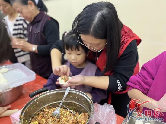 志愿者教孩子包餃子(舫星社區(qū)新時(shí)代文明實(shí)踐站 供圖)