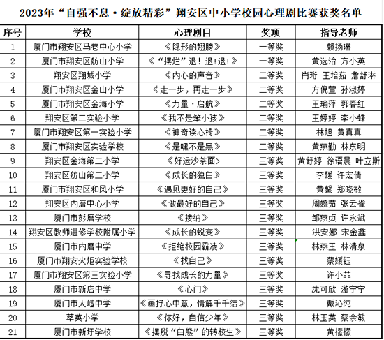 伴隨著專家評審打分及線上投票的落幕,本次中小學校園心理劇大賽結果出爐,最終,翔安區(qū)馬巷中心小學《隱形的翅膀》、舫山小學《“擺爛”退!退!退!》獲得一等獎,還有6所中小學的作品獲得二等獎、13所中小學的作品獲得三等獎。