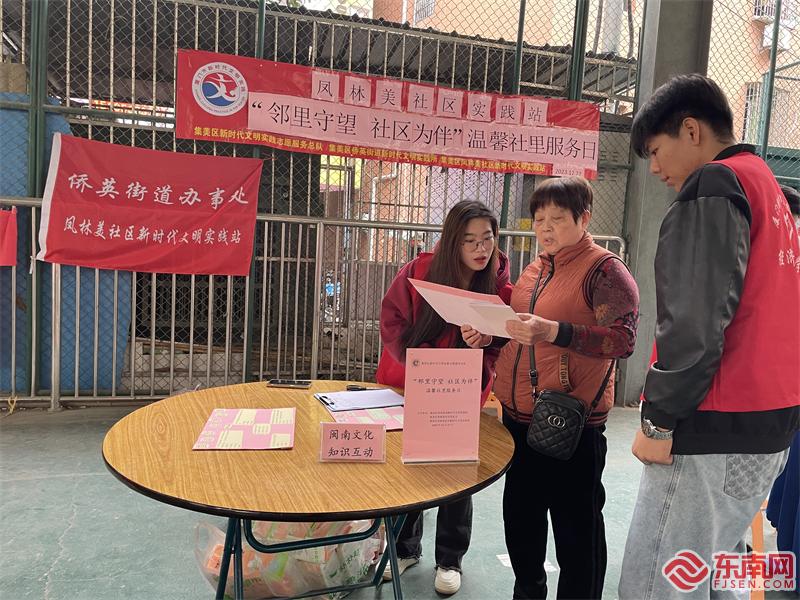 為弘揚、宣傳閩南文化,增強(qiáng)文化自信,鳳林美社區(qū)新時代文明實踐站開展“閩南文化知多少”趣味互動,邀請居民從閩南方言、民俗、建筑等方面進(jìn)行互動問答,促進(jìn)群眾對閩南文化的了解、傳承,讓閩南文化成為情感橋梁,促進(jìn)外來居民與社區(qū)和諧共融。