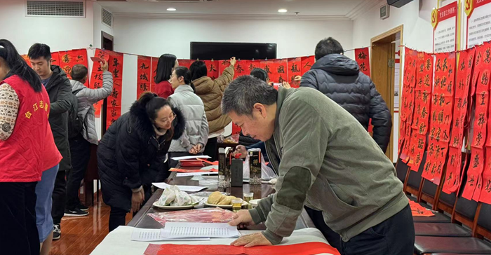 來領(lǐng)取春聯(lián)的人群絡(luò)繹不絕,簇擁在桌前,耐心排隊等待,從事先擬好的春聯(lián)詞語中,挑選自己心儀的內(nèi)容請志愿者書寫,并與志愿者探討各副春聯(lián)的蘊意,感受書法的魅力?,F(xiàn)場還有書法愛好者加入寫春聯(lián)的隊伍,拿出自己的書寫工具,為大家寫下新年祝福。