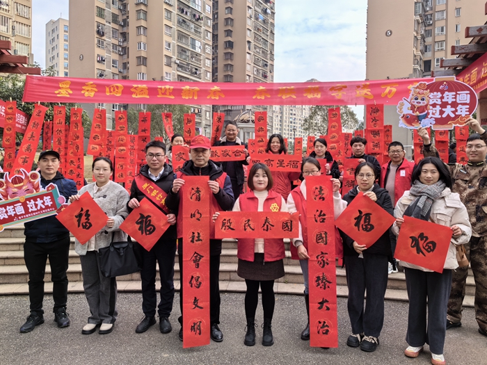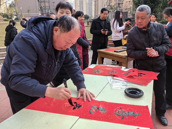 活動現(xiàn)場熱鬧非凡,紅色宣紙悉心鋪開,書法家志愿者們即席揮毫,下筆如行云流水,一副副寓意吉祥的春聯(lián)一氣呵成。精心書寫的一副副春聯(lián)、一個個形象生動的福字吸引了不少來往居民的目光與駐足,向居民展示書法魅力的同時,也送上了誠摯的新春祝福。居民們拿著紅紅火火寓意好兆頭的春聯(lián),高興不已,紛紛表示謝意。