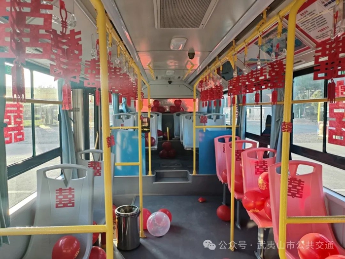 車廂內(nèi)則張掛著五彩氣球及雙喜剪紙,武夷公交經(jīng)營管理科供圖