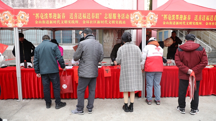 除了精彩的文藝表演,主辦單位還在現(xiàn)場(chǎng)設(shè)置了志愿服務(wù)集市。有寫(xiě)春聯(lián)送春聯(lián)、垃圾分類(lèi)宣傳、安全燃煙火宣傳、應(yīng)急救護(hù)知識(shí)普及、愛(ài)心義剪、口腔健康義診等志愿服務(wù)。一幅幅蘊(yùn)含著美好祝福和濃濃年味的春聯(lián)一氣呵成,喜慶的話語(yǔ)充滿了濃濃的年味,貼心服務(wù)不僅暖人心更合群眾的“口味”。
