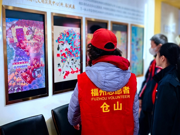志愿者在倉山區(qū)新時代文明實踐中心與群眾一同賞年畫(倉山區(qū)委文明辦 供圖)
