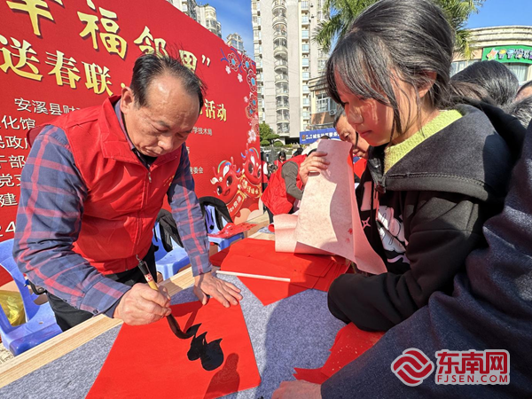 鋪紙、蘸墨、起筆……紅紙翻飛間一幅幅遒勁有力清爽灑脫的新春祝福躍然紙上。臨近春節(jié),安溪縣各個(gè)老黨員服務(wù)站從室內(nèi)走向室外,啟動(dòng)新春限定活動(dòng),他們化身桑榆志愿服務(wù)者,一件紅色小馬甲、一支毛筆、一瓶濃墨,用簡(jiǎn)單的裝備為群眾送上最濃的年味,在一筆一劃中讓年輕干部感知“廉”味。