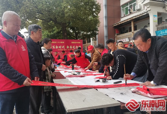 書法志愿者們?yōu)槭忻駥懘郝?lián)送福。德化縣委文明辦 供圖