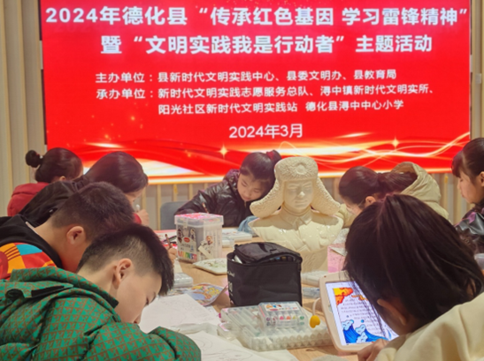 圖為孩子們邊欣賞雷鋒陶瓷作品邊繪制雷鋒主題手抄報(bào) 德化縣委文明辦。供圖