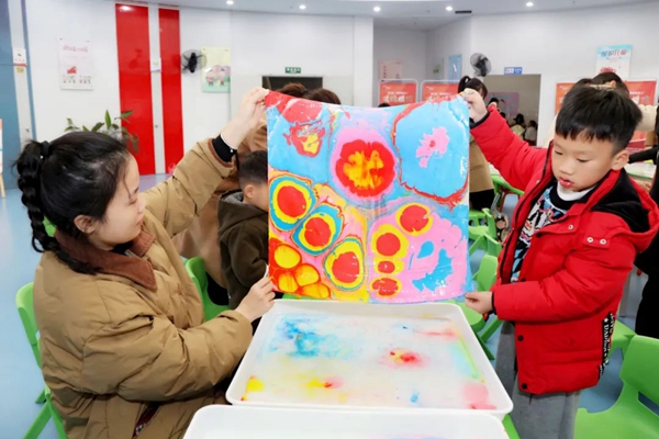 活動以親子活動“彩虹橋”溫暖開場,孩子們從一開始的羞怯、拘謹,慢慢地放松、舒展,進入了快樂游戲模式。媽媽帶領著寶貝們跟隨音樂快速前進,最終抵達終點。小小的游戲增進了親子之間的感情。孩子們和媽媽圍坐在一起,共同閱讀繪本《我媽媽》。孩子們用稚嫩的聲音講述著故事中的情節(jié),母親們則溫柔地陪伴著他們,一起感受媽媽對子女的深深愛意。隨后,孩子們用畫筆描繪出畫框里的媽媽形象,將作品獻給媽媽;喂媽媽吃水果,現場洋溢著幸福和滿足的微笑;孩子們還和媽媽們共同協(xié)作水拓絲巾,制作出屬于他們獨一無二的絲巾,感受非遺文化之美。