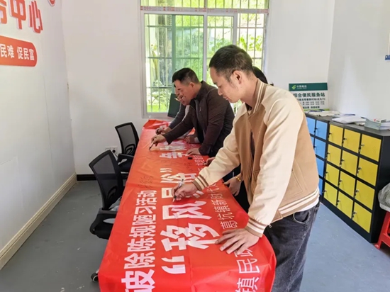 村民在承諾遵守村規(guī)民約的宣傳橫幅上簽名