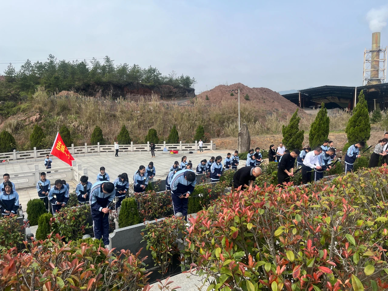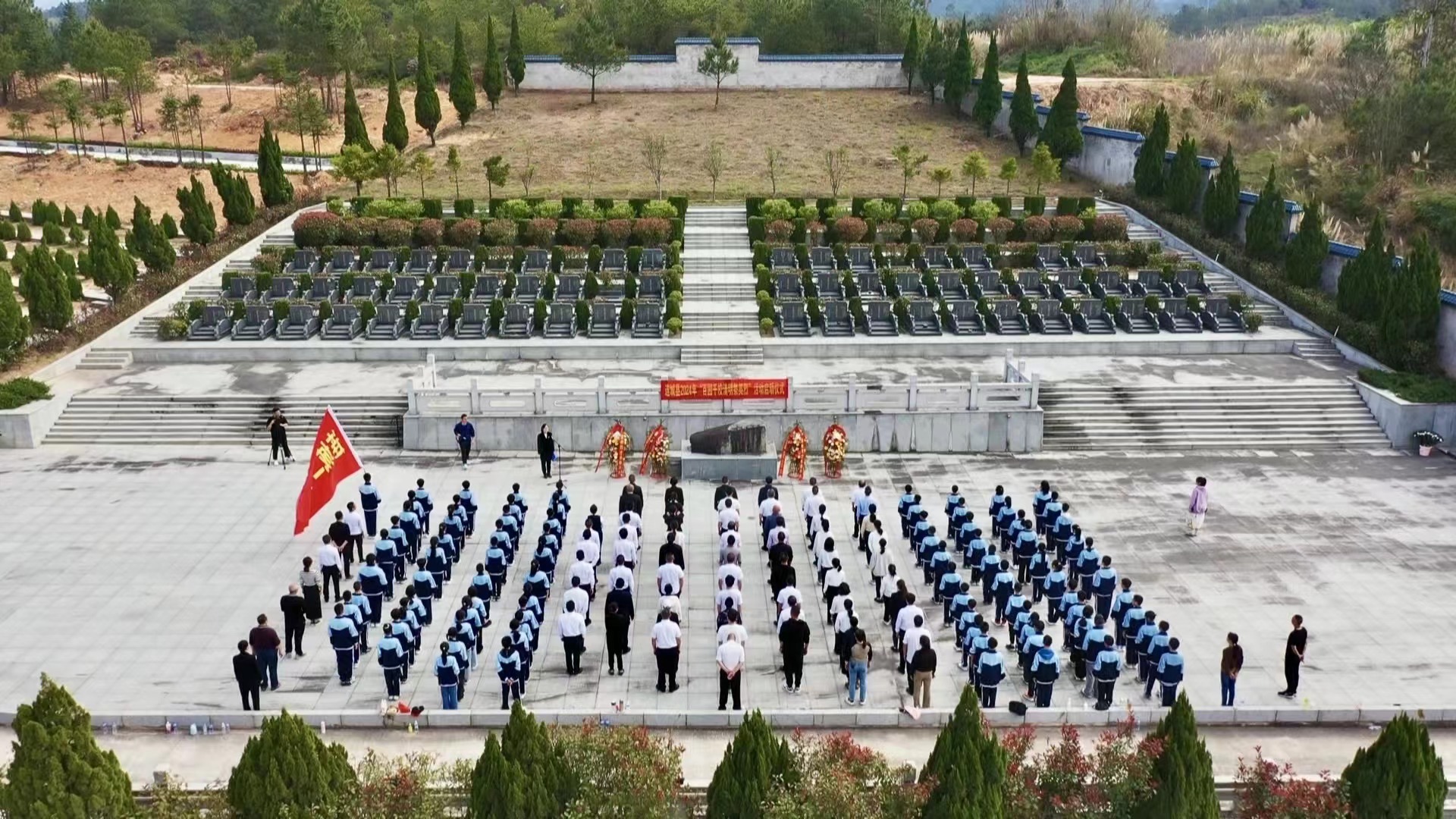 9時30分,全體人員整齊列隊、莊嚴肅立,奏唱中華人民共和國國歌。國歌唱畢,林威致辭向革命烈士表達最崇高的敬意,學生集體獻唱《我們是共產主義接班人》。獻唱畢,各單位相關負責人緩步上前,仔細整理花籃緞帶,全場向烈士鞠躬默哀。