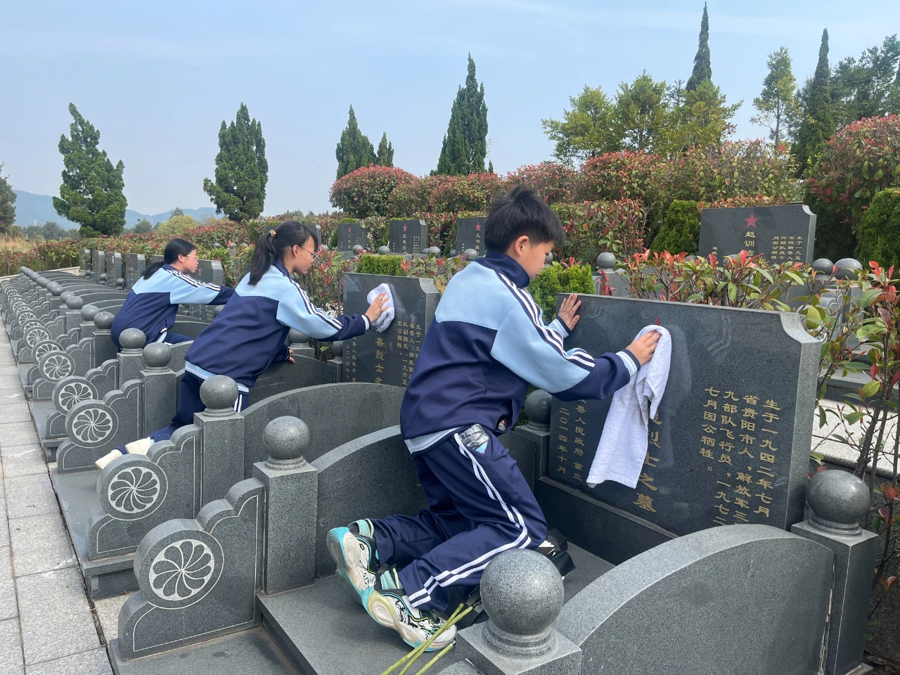 隨后,全體人員手持鮮花拾階而上,在烈士墓碑前深情凝視、緬懷先烈,將鮮花擺在烈士墓碑石階上寄托哀思。學生們懷著崇敬之心,認真擦拭烈士墓碑上的灰塵;手握畫筆,為烈士墓碑上的五角星描紅,一筆一劃中勾勒出對烈士的感恩之情。