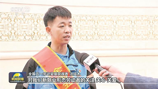 當(dāng)晚《新聞聯(lián)播》播出的畫(huà)面中,身穿藍(lán)色工作服的洪成木在大會(huì)現(xiàn)場(chǎng)顯得格外顯眼,他在現(xiàn)場(chǎng)接受采訪時(shí)說(shuō):“能感受到黨和政府對(duì)我們新就業(yè)形態(tài)勞動(dòng)者的關(guān)注、關(guān)心、關(guān)愛(ài),我會(huì)把這份榮譽(yù)傳遞給更多的外賣(mài)小哥,繼續(xù)服務(wù)好每一位顧客,為我們的城市建設(shè)貢獻(xiàn)一份力量。”