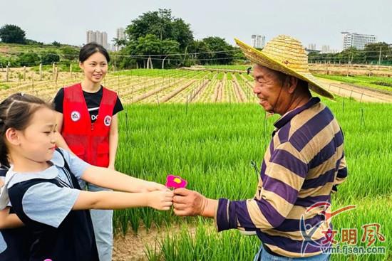孩子向身邊的勞動(dòng)者送上一朵小紅花(翔安區(qū)新時(shí)代文明實(shí)踐中心供圖)