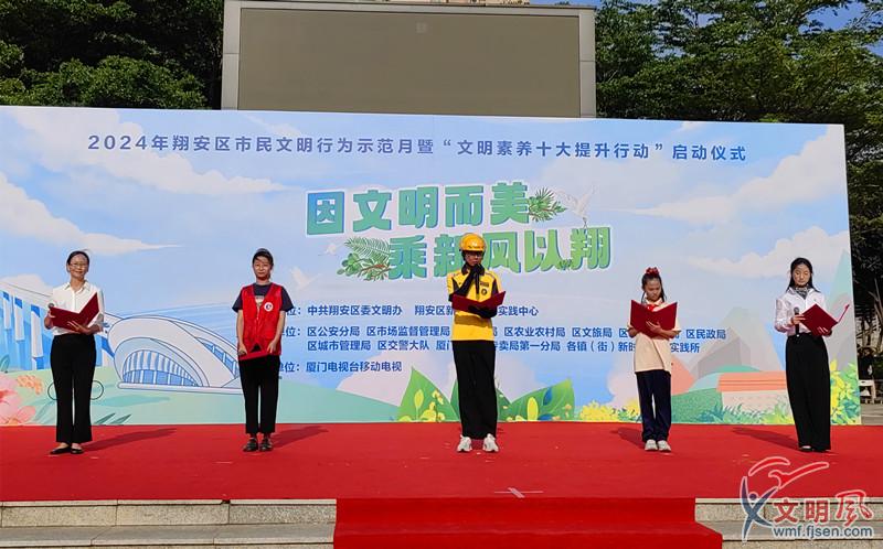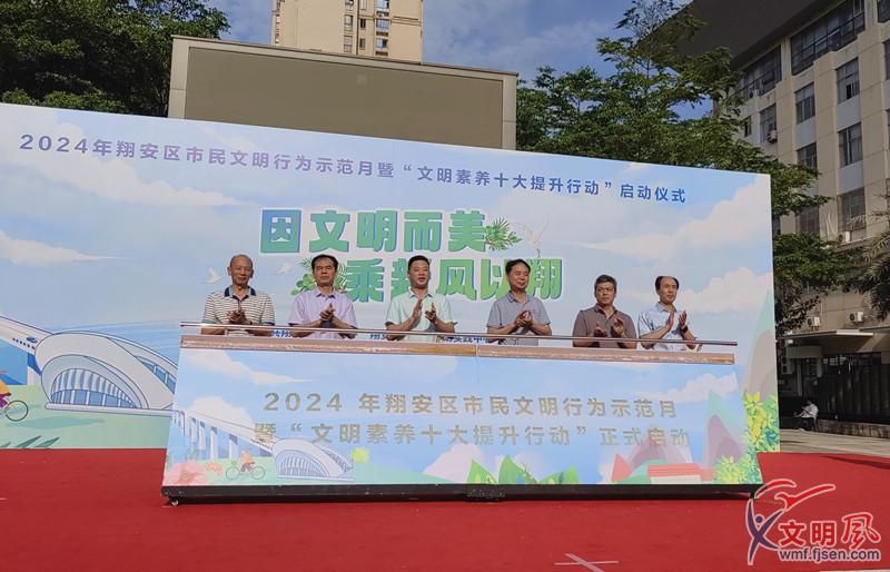文明風(fēng)5月11日訊 為持續(xù)提升市民文明素養(yǎng),深化文明城市創(chuàng)建,5月11日下午,“因文明而美,乘新風(fēng)以翔”——2024年翔安區(qū)市民文明行為示范月暨“文明素養(yǎng)十大提升行動”啟動儀式在廈門市翔安區(qū)法治文化廣場舉行。