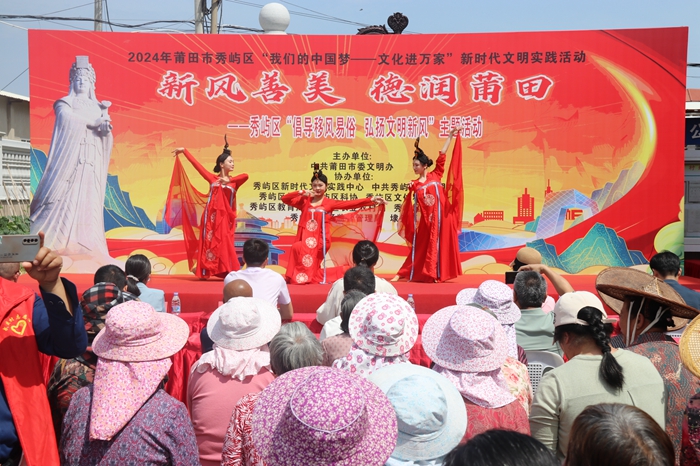 活動現(xiàn)場氣氛喜慶熱烈,活動在舞蹈《霓裳羽衣曲》中拉開帷幕。隨后,歌曲《和諧大家園》《在希望的田野上》《喜慶的日子》,小品《移風易俗》,舞蹈《大唐盛世》《功夫扇》,朗誦《中華頌》、莆仙贊句等精彩節(jié)目輪番上演。演員們用精彩的表演展現(xiàn)中華民族的偉大歷史和燦爛文化,體現(xiàn)了喜事新辦、杜絕浪費、孝老愛親等移風易俗內(nèi)容,把文明新風吹進群眾心坎里。