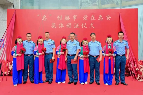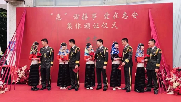 其中,一對駐惠部隊的新人王明祥、賀楊楨非常令人感動,妻子不遠千里追隨丈夫來到這里,共同創(chuàng)造幸福的小家。王明祥表示:“我在駐惠部隊工作已經(jīng)8年多,惠安是我的第二故鄉(xiāng),愛人不遠千里,從湖南過來惠安,共同生活,能夠在這么多人見證下領(lǐng)證,我感到十分幸福!”賀楊楨說:“我來自湖南,剛來惠安生活不久。來到這邊,主要是為了和我的愛人相互陪伴,共同為我們的小家拼搏?;莅铂F(xiàn)在是我的第二故鄉(xiāng),我很喜歡這里的惠女文化,所以今天也穿上惠女服飾來參加集體頒證儀式。同時,惠安是全國百強縣,我覺得這里的城市建設(shè)、交通等都很好,生活幸福指數(shù)比較高?!?/p>