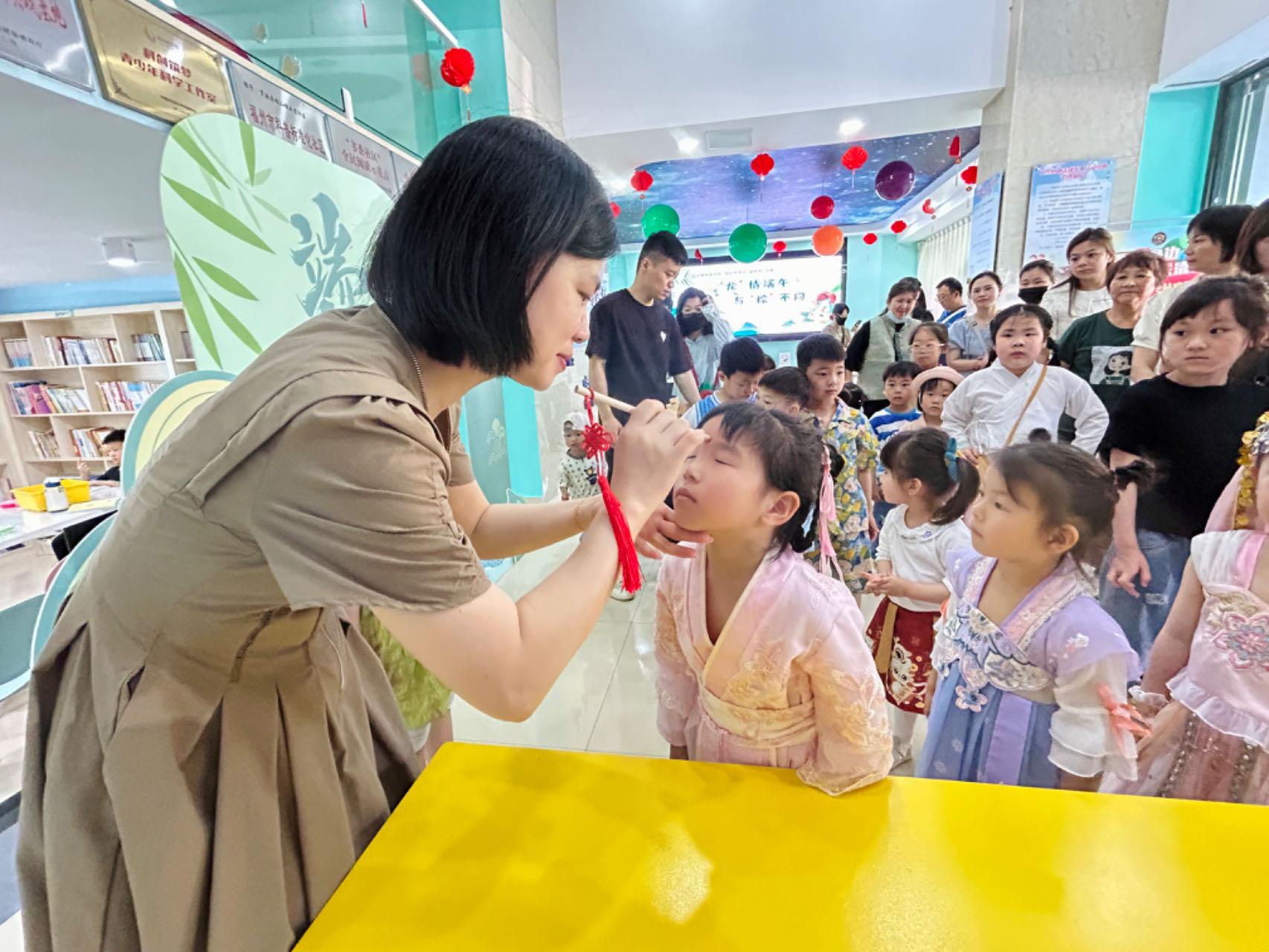 活動開始前,志愿者們?yōu)樾∨笥褌冾~頭點朱砂,這一傳統(tǒng)儀式寓意著驅(qū)邪避災,護佑孩子們健康成長。通過這一儀式,孩子們對端午節(jié)的獨特習俗有了初步的認識。