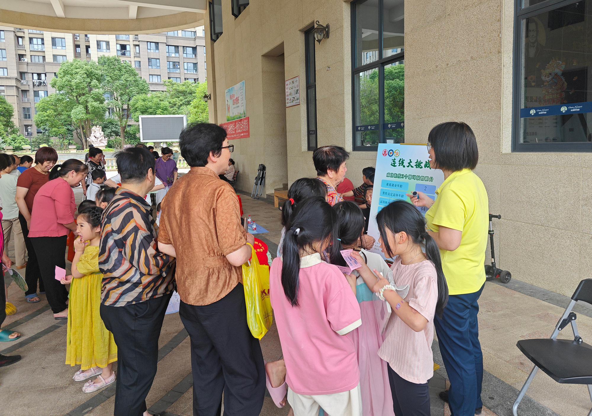 在趣味鄰里互動環(huán)節(jié),現(xiàn)場設置了“歡樂套圈”“勞動滾滾樂”“連線大挑戰(zhàn)”三個打卡點。在志愿者的引導下,居民有序排隊參加,在輕松氛圍中拉近鄰里關系。同時三個打卡點都加入了勞動法的相關知識,居民在游戲中也可以學習法律知識。