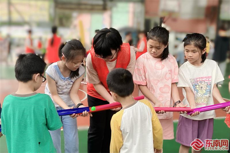 游園活動(dòng)現(xiàn)場(chǎng),青少年齊心協(xié)力,將球送到指定位置(三興社區(qū)新時(shí)代文明實(shí)踐站供圖)