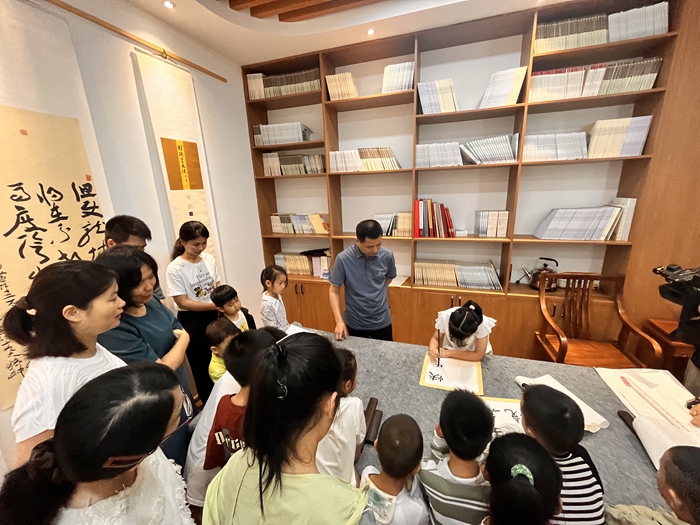 在“翰墨迎六一”的環(huán)節(jié),南靖書法家現(xiàn)場示范書寫書法作品,并為孩子們進(jìn)行現(xiàn)場指導(dǎo)。書法老師從基本筆畫、間架結(jié)構(gòu)、章法布局等多個方面,一筆一畫地給孩子指點,孩子們認(rèn)真傾聽、模仿,在書法家老師的悉心指導(dǎo)下,孩子們的書寫水平得到了提升,激發(fā)了孩子們對書法的興趣,提高孩子們對書法的熱愛。