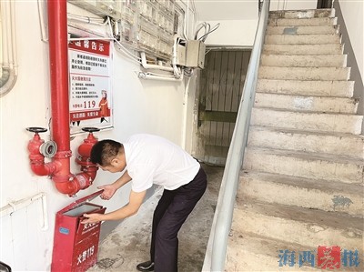 物業(yè)企業(yè)黨員志愿者進(jìn)小區(qū)檢查消防設(shè)施。 鷺江街道供圖