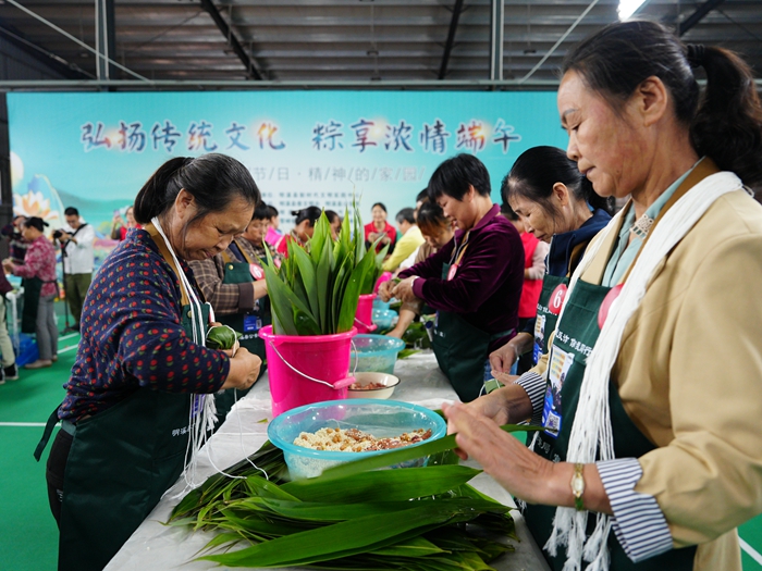 活動中,明溪縣公安局組織刑偵、交警、禁毒、出入境等多個警種部門以“普法小課堂”、有獎競答、典型案例解說、發(fā)放宣傳資料等形式向群眾普及相關法律知識,重點開展禁毒、防范電信網(wǎng)絡詐騙、防范道路交通事故、嚴打非法出入境等法治宣傳教育,進一步提高社區(qū)群眾的法治觀念和防范意識,引導群眾遵守法律法規(guī),共同營造安全、文明、和諧的社會治安環(huán)境。隨后,由全縣各社區(qū)居民代表30人組成的6支隊伍進行包粽子比賽,經(jīng)驗豐富的居民巧手翻飛、動作流暢,一折葉,二放料,三壓實,四封口,五扎繩,一會兒工夫,精美的粽子堆滿了桌子?,F(xiàn)場歡聲笑語不斷,洋溢著濃濃的節(jié)日氛圍。