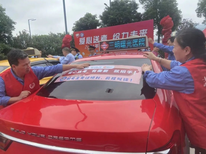 志愿者共同在愛心送考車輛貼上愛心送考標(biāo)志