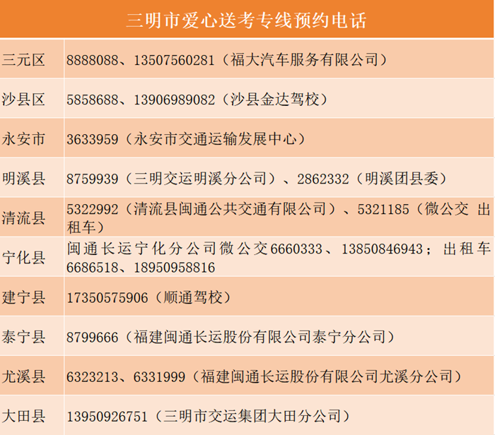 三明各縣(市、區(qū))紛紛響應(yīng),全市1000多輛愛心送考車輛已準(zhǔn)備就緒,免費(fèi)接送高考學(xué)子前往考場,助力莘莘學(xué)子圓夢。三明高考考生可撥打預(yù)約電話,預(yù)約愛心送考車輛進(jìn)行點(diǎn)對(duì)點(diǎn)接送;也可以通過定點(diǎn)、招手等方式,免費(fèi)乘坐張貼“愛心送考車”標(biāo)志的送考車輛前往考場。