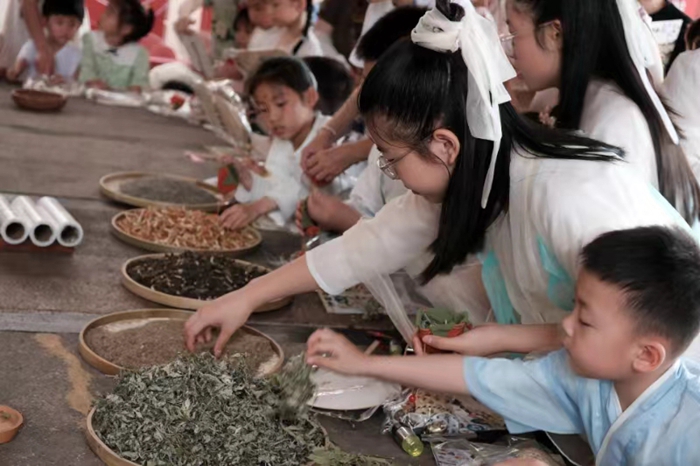 孩子們身穿漢服,在花叢間、在議事亭內(nèi),體驗制作艾草掛件、香囊,拓印團扇,比賽射五毒、投壺……在游園活動中共同體驗端午節(jié)的傳統(tǒng)習俗,感受傳統(tǒng)文化的魅力與韻味。