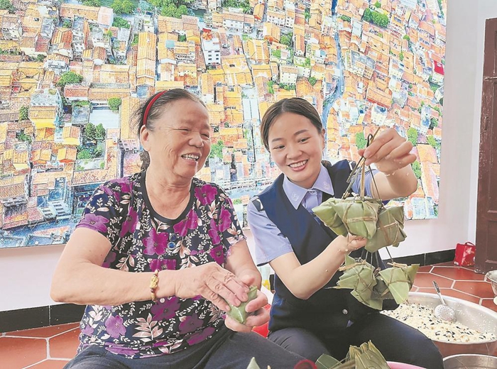 涵西街道蘿苜田黨建鄰里中心舉辦“相親相愛一家人”鄰里文化節(jié)。圖為網(wǎng)格員與社區(qū)居民一起包粽子,其樂融融。鄭潔 攝