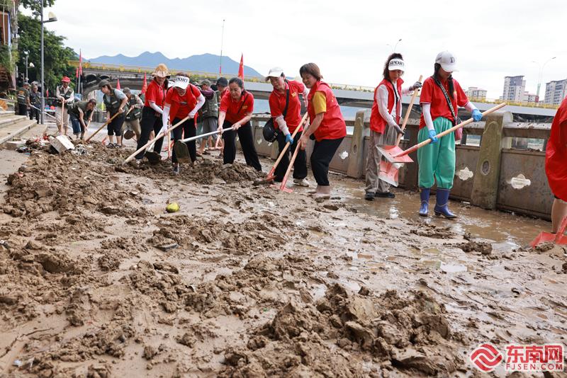 6月20日上午,順昌縣城關(guān)富屯溪沿江漫道上,順昌縣新時代文明實踐中心志愿服務(wù)隊和社會志愿服務(wù)隊員們,正在忙碌著。一抹抹紅色,同腳下的淤泥,溪上退去的洪水形成鮮明的對比,分外鮮艷。
