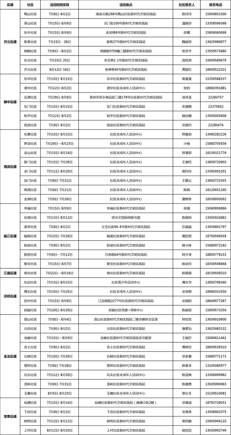 為豐富廣大未成年人暑期生活,方便他們就近就便參與社區(qū)新時代文明實踐活動,今年暑假期間,鯉城區(qū)委宣傳部(文明辦)及區(qū)直相關部門在社區(qū)組織開展47個新時代文明實踐快樂暑期活動營,社區(qū)7-16周歲的未成年人均可報名參加。