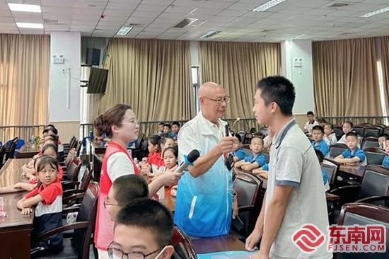 集美區(qū)關(guān)工委講師團(tuán)成員喻海洪(中)與學(xué)生互動(寧寶社區(qū)新時代文明實踐站供圖)