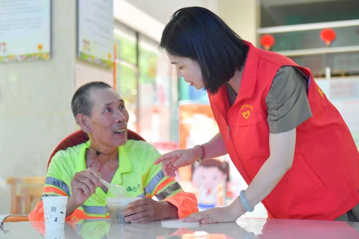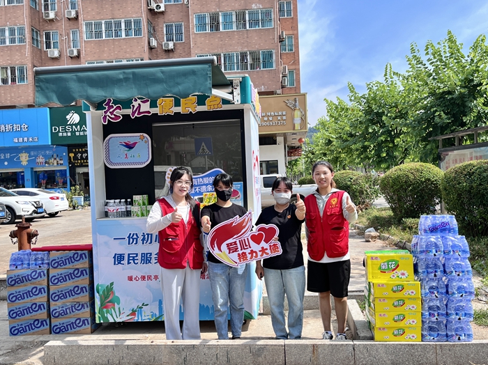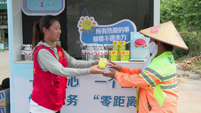 五里社區(qū)文明實踐志愿者為戶外工作者遞上了清涼的綠豆湯。