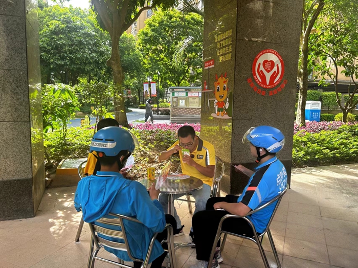 此外,在便民服務(wù)點旁邊還設(shè)置了“暖心驛站”,為外賣配送員、戶外工作者們等新就業(yè)群體提供歇腳、應(yīng)急等暖心服務(wù),讓他們渴了能喝水,累了能歇腳。