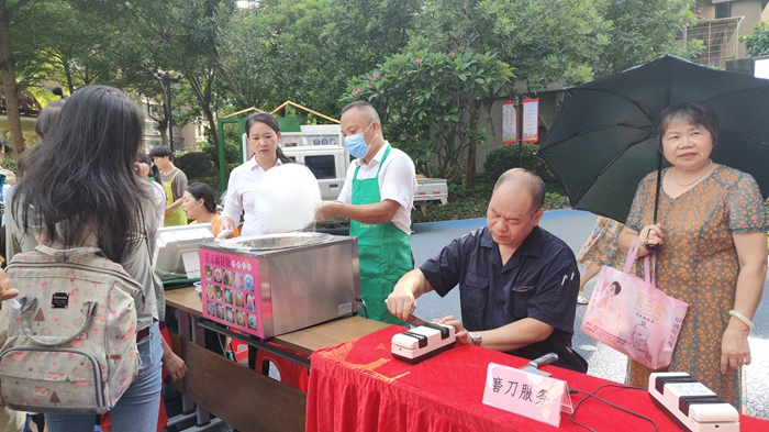活動現(xiàn)場熱鬧非凡,居民們根據(jù)自身需求,有的讓志愿者幫忙量血壓,有的耐心排隊磨菜刀或剪刀,有的讓志愿者幫忙理頭發(fā)……正值三伏天,福隆社區(qū)中醫(yī)閣還為居民免費提供三伏艾灸服務(wù)。