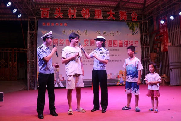 演出現(xiàn)場還設(shè)置了交通安全知識有獎問答環(huán)節(jié),全方位的互動將整場活動推向高潮,現(xiàn)場氛圍熱烈,在互動中把交通安全意識深入現(xiàn)場村民心中。