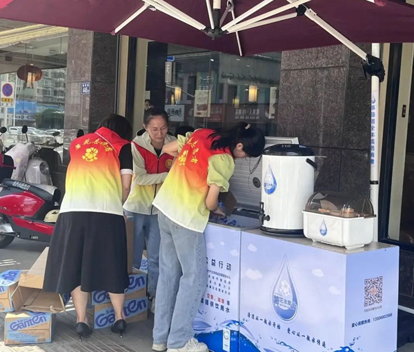 愛(ài)心取水點(diǎn)提供礦泉水、溫水、水杯、紙巾等,為快遞小哥、環(huán)衛(wèi)工人等戶外勞動(dòng)者無(wú)償提供飲用水,并安排薯花志愿者輪班負(fù)責(zé)補(bǔ)給。值得一提的是,每個(gè)愛(ài)心取水點(diǎn)配備的遮陽(yáng)傘、冰柜、保溫桶、紙杯、礦泉水等物資,均由熱心市民、志愿者、企業(yè)捐贈(zèng)。