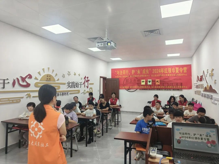 7月31日上午,不同學(xué)校、不同年級(jí)的少年們?cè)谶B江縣新時(shí)代文明實(shí)踐中心相聚一堂,參加“與法同行,護(hù)‘未’成長”2024年紅領(lǐng)巾夏令營開營式,正式開啟為期五天的法治研學(xué)之旅。