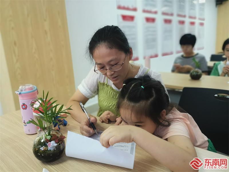 親子生態(tài)研學現(xiàn)場,圖為填寫親子研學任務卡(蓮亭社區(qū)新時代文明實踐站供圖)