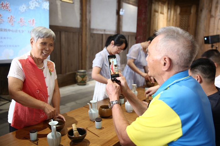 隨后的“宋代點茶”環(huán)節(jié)讓大家沉浸在茶藝之中,體驗宋代的文化與浪漫。主持人介紹了點茶的步驟和技巧,并協(xié)助參與者親手完成這一過程。品嘗著自己親手點制的茶,一位結(jié)婚55年的王先生感慨道:“盡管點茶的過程復(fù)雜,但能夠品味到這獨特的茶香,感覺非常值得。”點茶不僅讓參與者感受到非物質(zhì)文化遺產(chǎn)帶來的魅力,同時也感受到七夕節(jié)的浪漫與人文情懷。
