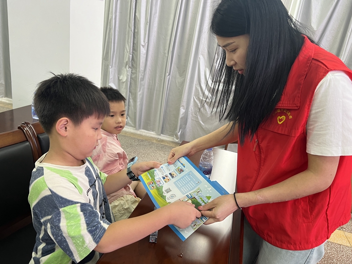 文明實(shí)踐志愿者向小朋友發(fā)放《中小學(xué)生交通安全小知識(shí)》宣傳材料