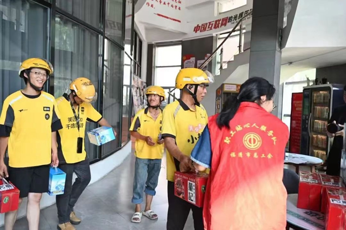 志愿者為外賣員發(fā)放清涼物資。 福清市總工會(huì)供圖