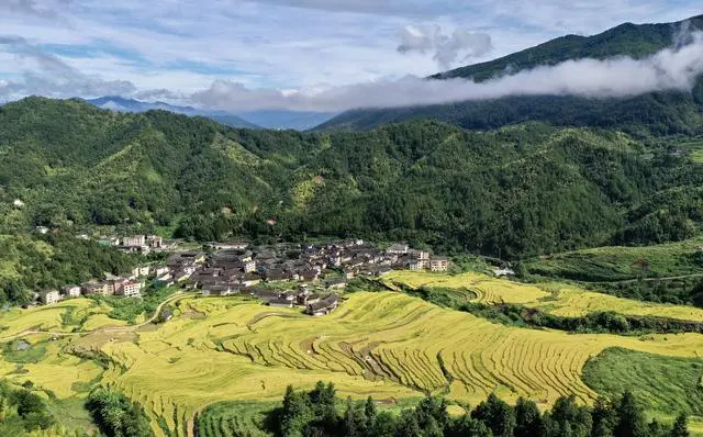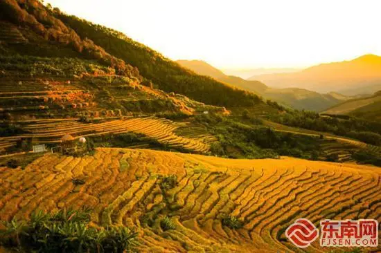 每年9到10月,金色的稻田掩映在群山、土樓之間。登上觀景臺,金秋季節(jié)里泛著濃濃的稻香,層層梯田翻金浪,這是初溪土樓古村落最美的季節(jié)。
