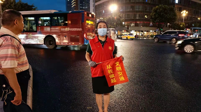 鼓東街道樹兜社區(qū)市民委員會代表高建華參與文明交通勸導。鼓東街道供圖